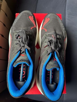 Zapatillas de running Puma con detalles en azul y rojo. - Diseño moderno y deportivo. - Suela con tecnología Nitro. Solo usada dos veces en cinta, jamás en la calle. Están nuevas.