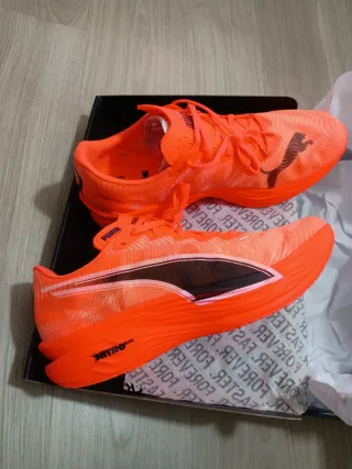 Vendo Zapatillas de running Puma Deviate Nitro 3 en talla 42 de hombre. Perfecta zapatilla mixta de la marca Puma para entrenos de series de velocidad y competición con placa de carbono. Las zapatillas están impecables, solo tiene ese desperfecto en el interior del talón como se ve en la ultima foto, de ahi su precio. Se han usado unos 50km. No escucho ofertas ridículas ni cambios