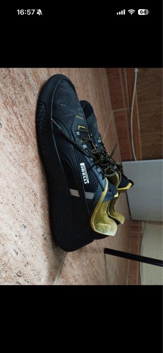 Zapatillas Puma con detalles Pirelli, en buen estado y con poco uso. - Combinación de colores negro y dorado. - Diseño deportivo y moderno.