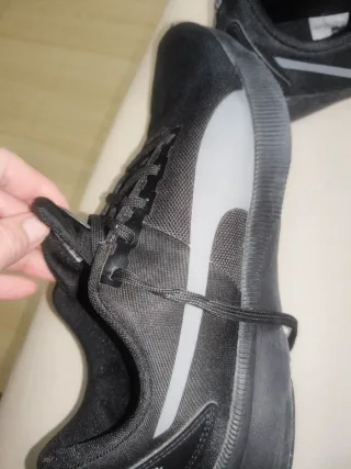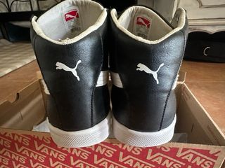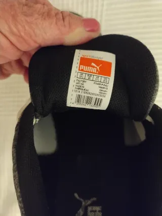 Zapatillas Puma en color negro con detalles blancos. Incluye cordones. Tiene un pequeño defecto por dentro en el talon en los ambos pies por lo demas en buen estado.