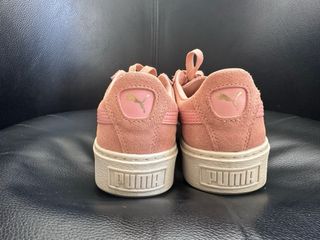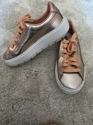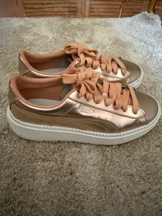 Zapatillas Puma modelo Basket con un acabado metalizado en tono dorado rosado. Usadas en dos ocasiones. Quedan ideales. compradas en Corte inglés - Cierre con cordones. - Suela blanca de plataforma. - Detalle del logo Puma Basket en el lateral.