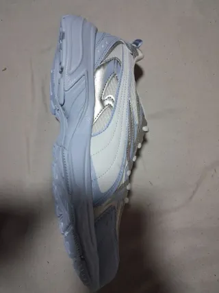 Zapatilla deportiva con un diseño moderno y llamativo. - Combinación de colores azul claro y plateado. - Detalles metálicos. - Cierre con cordones.
