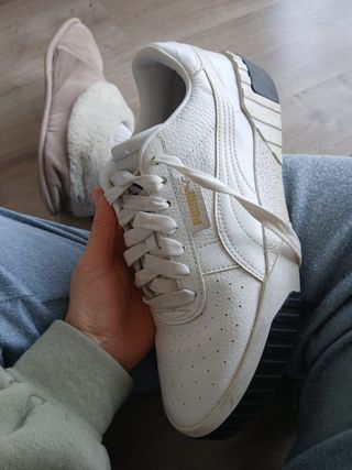 Zapatillas Puma blancas, talla 40 EUR. Ideales para un look casual. Están en buen estado, aunque presentan un ligero desgaste por el uso. - Modelo Puma Carina. - Fabricadas en Camboya. - Talla UK 7.5, US Wms 10, CM 26.5