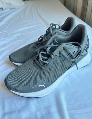 Zapatillas deportivas Puma para hombre en tonos grises y blancos. Diseño moderno y cómodo. - Parte superior de malla transpirable. - Suela de goma para mayor tracción. - Cierre con cordones. - Detalle de logo Puma. Zapatillas hombre Puma, en perfecto estado usadas una única vez. Están como de tienda excepto por el descosido de la punta que se ve en la foto. Por eso el precio. No se nota y son zapatillas de calidad. Hago envíos rápidos!👍🏻😘