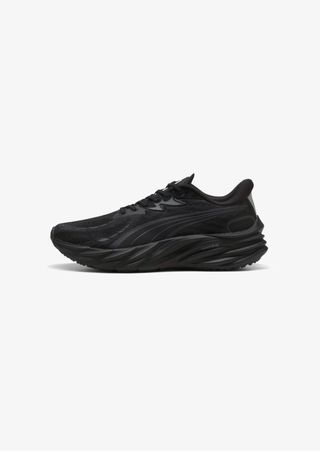 Zapatillas deportivas Puma con un diseño moderno. - Combinación de colores negro y naranja. - Logo de Puma visible en los laterales y el talón.