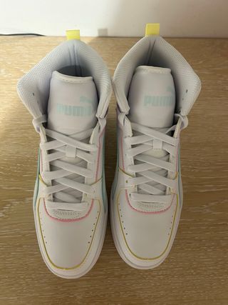 Zapatillas altas de la marca Puma en color blanco con detalles en morado, lila y rosa pálido. - Diseño de caña alta. - Combinación de colores pastel en los laterales y cordones. - Logo de Puma visible en el lateral.