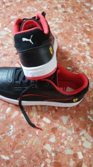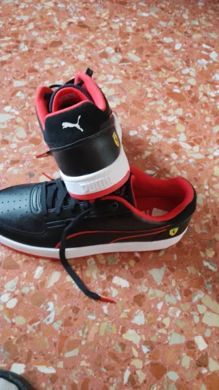 Zapatillas deportivas Puma con diseño inspirado en Ferrari. - Color negro con detalles rojos. - Utilizdas dos veces - Talla 41.