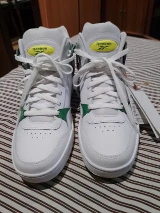 Zapatillas altas de la marca Reebok en talla 44. Combinan el blanco con detalles en verde. - Diseño de caña alta. - Cierre con cordones blancos. - Logo de Reebok en la lengüeta.