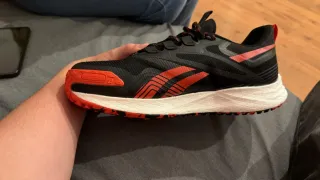 Zapatillas deportivas Reebok en talla 44 EU. - Diseño moderno en negro con detalles en rojo. - Suela blanca con líneas dinámicas. -Nuevas, solo se usaron al probarse, en venta por ser un regalo de talla incorrecta.