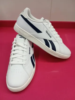 Zapatillas deportivas de la marca Reebok para hombre. - Diseño clásico en blanco con detalles en azul marino. - Logo de Reebok visible en el lateral y la lengüeta. - Cordones blancos. - Suela de goma. - Nuevas a estrenar no se a usado - No quedó presencial solo envio