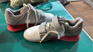 Zapatillas deportivas Reebok Legacy, diseñadas para halterofilia y CrossFit. Con suela elevada y correas de sujeción. - Diseño en color blanco y gris. - Suela de goma roja. - Cierre con cordones y velcro.