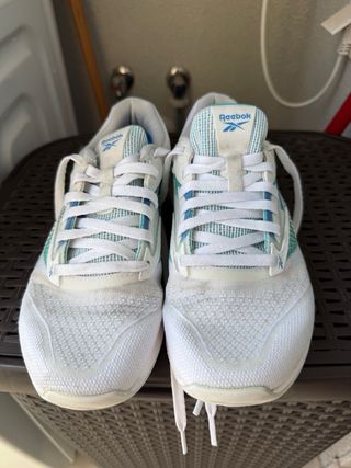 Zapatillas deportivas Reebok Nano X4 en color blanco y verde azulado. - Diseño moderno y transpirable. - Muy poco uso y bien cuidadas. - Talla 38 EUR (245mm)