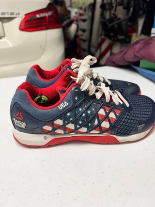 Zapatillas deportivas Reebok en tonos azul y rojo, perfectas para entrenamientos. - Diseño deportivo. - Cierre con cordones blancos. - Detalle de logo en la lengüeta.