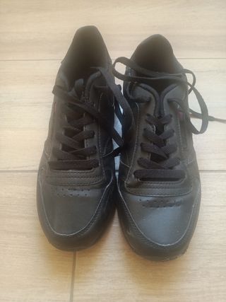 Zapatillas Reebok clásicas en color negro, talla 38/39. - Diseño atemporal. - Material exterior de cuero. Usadas pero aceptables