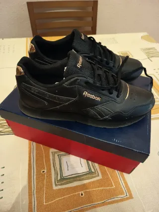 Zapatillas deportivas Reebok para mujer. Es un 41 "pequeño" podría valer para un pie del 40. En su caja original. Usadas muy poco ya que mi pie es un 41 "grande" y me van justas - Diseño en color negro con detalles dorados. - Cierre con cordones. - Logo de Reebok en el lateral y la lengüeta.