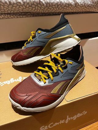 Zapatillas deportivas Reebok Nano X2 edición especial Wonder Woman. - Diseño inspirado en Wonder Woman. - Combinación de colores llamativa con detalles dorados y burdeos. - Cordones amarillos. - Suela blanca. Solo puestas una vez dentro de casa.