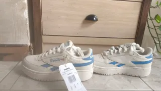 Zapatillas Reebok Club C Double Revenge en color beige con detalles en azul. Talla 42.5. - Diseño clásico y versátil. - Suela gruesa para mayor comodidad.