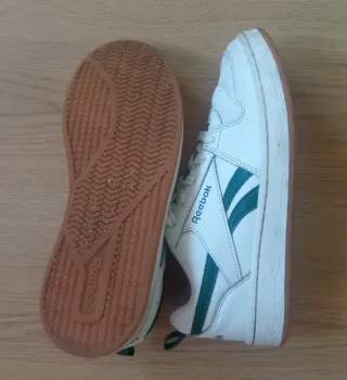Zapatillas deportivas Reebok con un diseño moderno y cómodo. Muy pocas puestas. - Exterior de cuero blanco. - Detalles en color verde. - Suela de goma marrón.