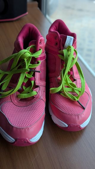 Zapatillas Reebok en color rosa para mujer, ideales para hacer deporte. Son de caña media y tienen cordones verdes. Están en buen estado y listas para usar. - Modelo cómodo y ligero. - Suela blanca en perfecto estado. - Perfecto para uso diario.