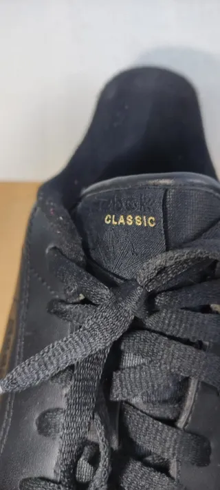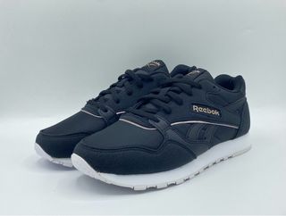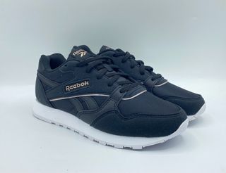 Zapatillas deportivas Reebok en color negro con detalles dorados. Disponibles en talla 36 y 39. - Diseño moderno y ligero. - Cierre con cordones. - Suela blanca.