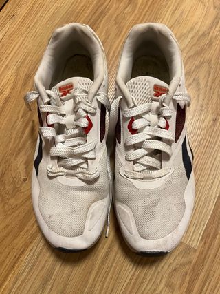Zapatillas deportivas Reebok en color blanco. - Diseño moderno y cómodo. - Detalles en color burdeos y azul marino. - Cierre con cordones. Estan un poco sucias pero con una lavada son blancas y parecen nuevas. Poco usadas y en perfectas condiciones. No tienen plantillas.