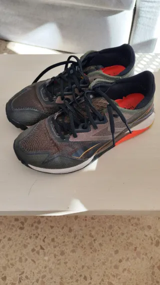 Zapatillas deportivas Reebok NANO, ideales para CrossFit y weightlifting. Combinan tonos marrones y verdes con detalles llamativos. Casi sin uso. se puede ver en la suela y en su estado general. - Cierre con cordones negros. - Suela de goma. - Interior con plantilla naranja.