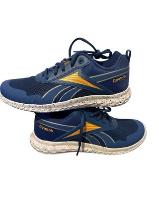 Zapatillas deportivas Reebok en talla 38, con una combinación de colores azul y amarillo. Precio negociable - Diseño deportivo. - Detalles en amarillo vibrante. - Cierre con cordones.