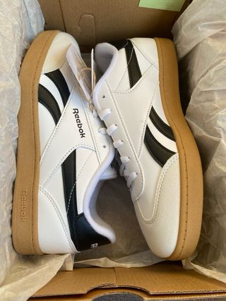 Zapatillas deportivas de la marca Reebok. Talla 38 (24.5 cm) - Diseño clásico en blanco con detalles en negro. - Suela de goma en color marrón. - Cierre con cordones.