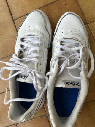 Zapatillas deportivas de estilo vintage. - Diseño clásico de Reebok. - Combinación de colores beige y blanco. compradas en 1998, guardadas y están bien, en ja suela le fakta una cosa pero no interfiere con caminar. he alucinado de lo bien q están. sn de piel y ja piel está muy bien.