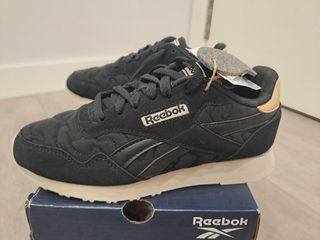 Zapatillas deportivas Reebok en talla 38. Combinan un diseño clásico con detalles modernos. - Color azul marino con suela marrón. - Cierre de cordones.