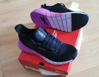 Zapatillas deportivas Reebok en talla 48.5. - Diseño en color negro con detalles en rosa y azul. - Cierre con cordones y sistema de ajuste rápido. - Suela con tecnología Floatride Energy.