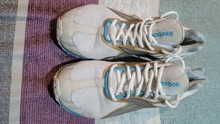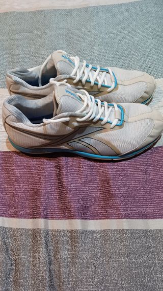 Zapatillas Reebok en talla 39, con una combinación de colores beige y azul. - Diseño deportivo. - Cordones de ajuste. - Suela de goma.