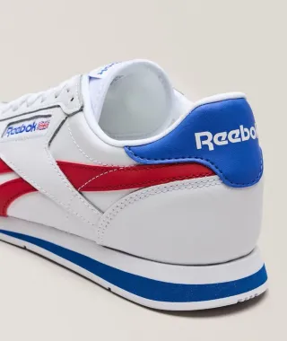 Zapatillas deportivas Reebok con un diseño retro y moderno. - Combinación de colores blanco, gris, negro, rojo y azul. - Logo de Reebok en la lengüeta y lateral.