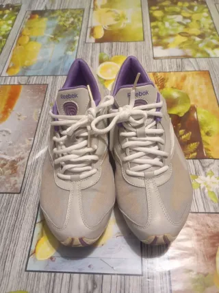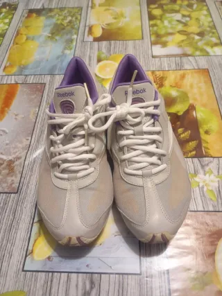 Zapatillas deportivas Reebok en color beige con detalles morados. - Talla 38.