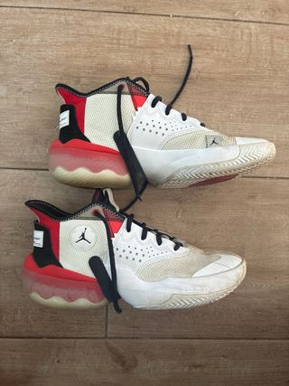 Zapatillas deportivas Jordan con un diseño llamativo. - Combinación de colores blanco y rojo. - Detalle del logo Jordan.