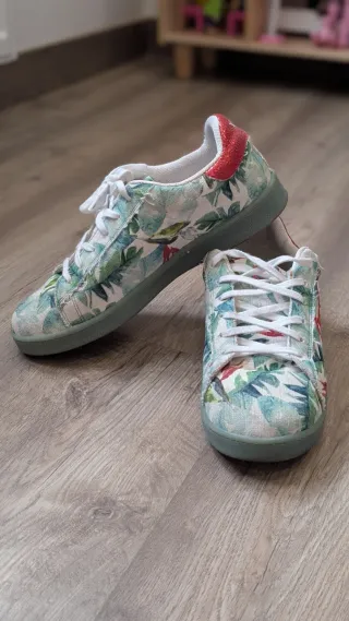 Zapatillas de diseño icónico con detalles florales. - Combinación de colores rojo y blanco. - Talla 38.