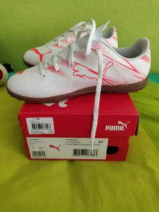 Zapatillas de fútbol con tacos en muy buen estado. Diseño vibrante con detalles en amarillo. - Cierre con cordones. - Suela con tacos para césped artificial. - Marca visible en el lateral.