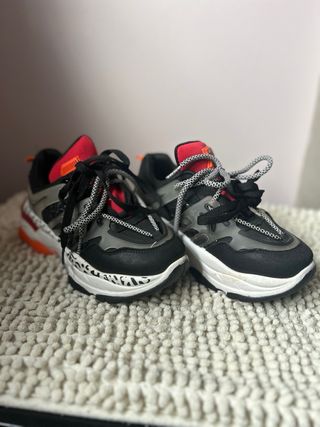 Zapatillas deportivas con un diseño moderno y llamativo. - Combinación de colores negro y rojo. - Cordones blancos y negros. - Detalle naranja en la lengüeta.