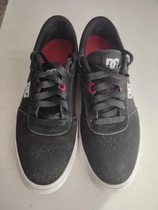 Zapatillas de la marca DC Shoes en talla 43. La derecha tiene algunas letras borradas por lo demás muy bien. Ni rotas ni despegadas - Diseño en color negro con detalles en rojo. - Logo de la marca en el lateral.