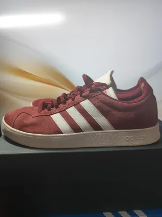 Zapatillas deportivas Adidas VL Court 2.0 en color rojo burdeos. Usadas - Diseño clásico con las tres franjas blancas. - Material de ante. - Suela de goma.