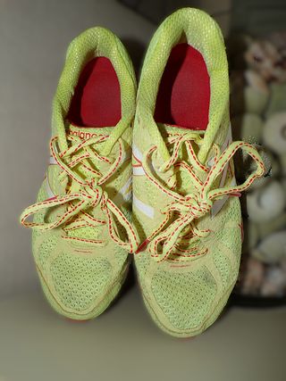 Zapatillas deportivas New Balance en llamativos tonos amarillo y rojo. Perfectas para correr o para un estilo casual. - Diseño deportivo. - Cordones a juego en perfectas condiciones. - Artículo usado y bien conservado, las unicas perfecciones son unas leves manchas en la suela que pueden limpiarse