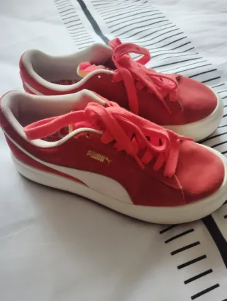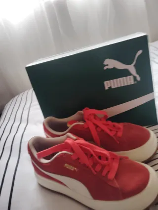 Zapatillas deportivas Puma de ante en color rojo con detalles blancos. Perfectas para el día a día.Es un 38 pero calza para un 37 . - Cierre con cordones. - Suela de goma blanca.