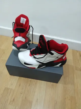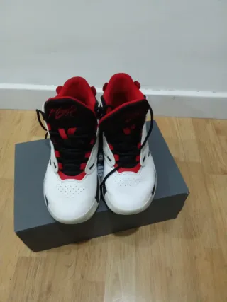 Zapatillas deportivas de la marca Jordan. - Diseño en color blanco con detalles en rojo. - Cordones blancos. - Suela negra. Solo me las he puesto una vez porque me quedan pequeñas