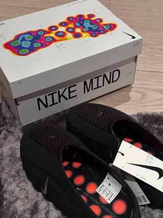 Zapatillas Nike Mind 001 en talla 44. - Diseño moderno en negro y rojo. - Detalle de logo en la suela. - Estampado interior con círculos rojos.