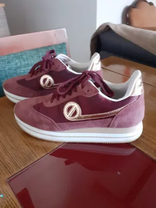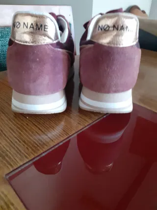 Zapatillas de la marca No Name en talla 37. Combinan detalles en gamuza y material sintético con un toque dorado. Es rojo burdeos. - Diseño deportivo. - Cierre con cordones. - Detalle de logo circular dorado en el lateral.
