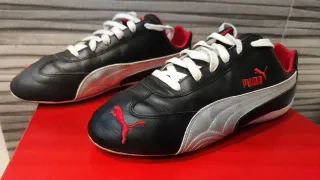 Puma Speedcat Custom Factory 2010 Leather – Rare Colorway – EU 42 / US 9 - Excelente estado Se vende un par de zapatillas Puma Speedcat hechas a medida, producidas a través del programa de personalización Puma Factory entre 2010 y 2011. No formaron parte de un lanzamiento comercial estándar y se fabricaron por encargo. Este par se configuró personalmente en su momento e incluye: - Parte superior de cuero negro - Franja característica plateada - Logotipos de Puma bordados en rojo (lateral y puntera) Silueta clásica de perfil bajo de automovilismo Las zapatillas solo se han usado dos veces, ya que se pidieron media talla menos.