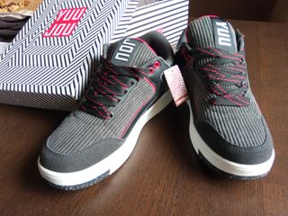 Zapatillas de la marca Yuu Jou en talla 38. Diseño moderno negras con detalles en gris y rojo. - Cordones rojos y negros. - Suela blanca. - Detalle de logo en la lengüeta.