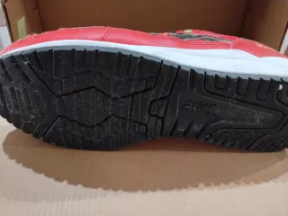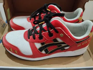 Zapatillas deportivas Asics Gel Lyte III con un diseño llamativo en rojo y blanco. - Combinación de cuero y malla. - Detalles en negro y dorado. - Cierre con cordones negros. - Suela blanca. Usadas pocas veces Solo envío por wallapop con opción de envío por inpost no utilizamos correos
