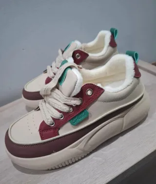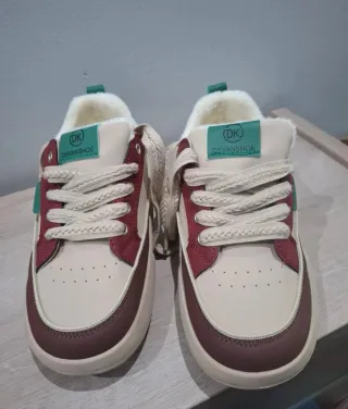Zapatillas de moda con un diseño moderno y detalles en contraste. Pone 39 pero es un 37 porque tallan pequeñas. Foto de la medida de la platilla. - Exterior en tonos beige y burdeos. - Forro interior suave y cálido. - Detalle de etiqueta SPORT en color verde. - Suela gruesa y cómoda.
