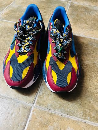 Zapatillas Puma Running System con un diseño vibrante y moderno. - Combinación de colores llamativos: azul, rojo, amarillo y multicolor. - Cordones con estampado geométrico. - Talla 42,5